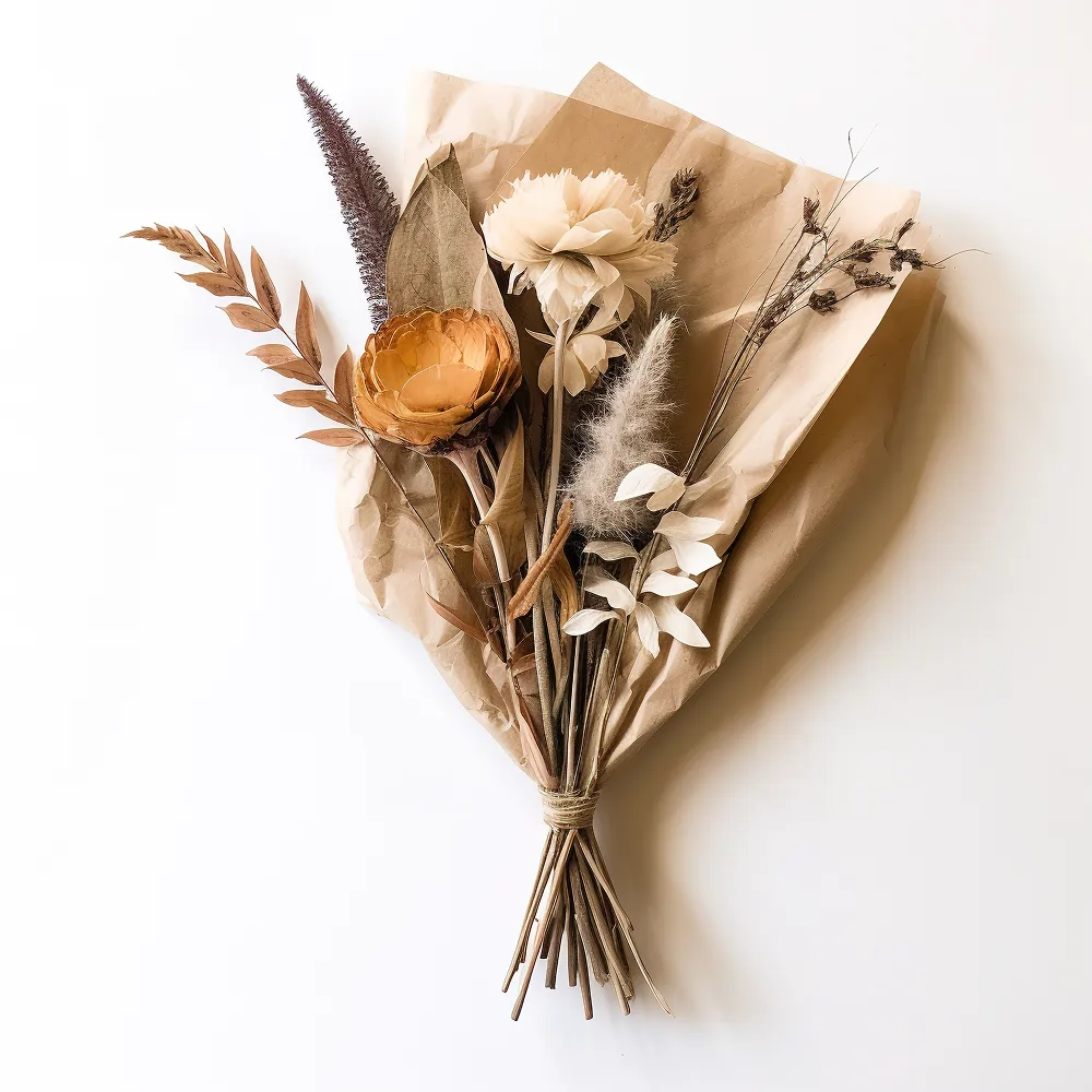Szárított virágcsokor pasztell narancs, sárga és krémszín árnyalatokban.